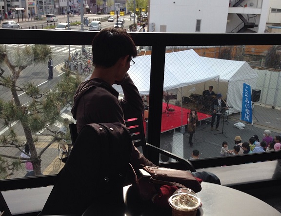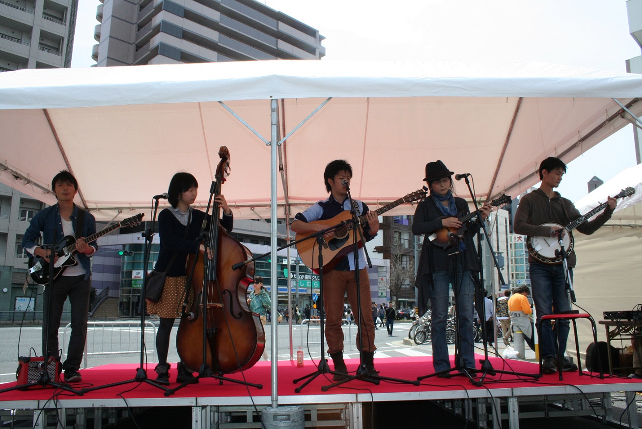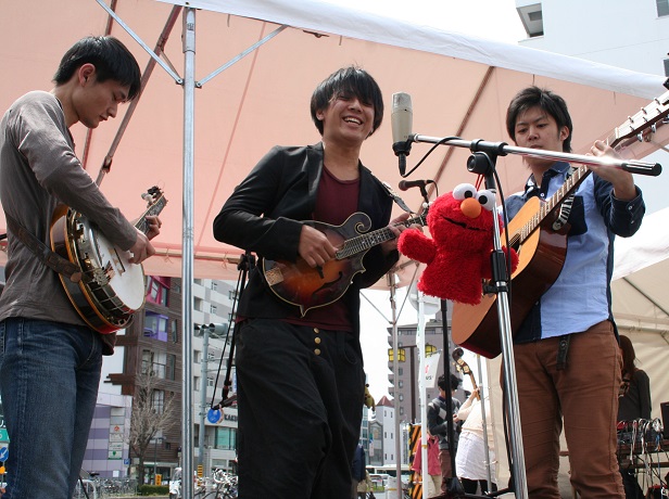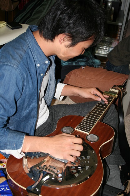 ブルーグラッサーはハイロンサム感を出すために孤高であるべし、というモットーのつばささん。カッコつけて、カフェテラスから1人でステージを見下ろしていました。この写真を撮ったのは一緒にお祭りを回っていた可愛いフィドラーさんなので、突っ込みたいものがありますが…(笑)こちらは、どぶろひかないぞうことまーしーの数年ぶりのドブロ姿。お祭り後の飲み会に、リザーブメンバーであるたみーがドブロを持ってきてくれたのでまーしーにブルーリッジを弾かせてみました。意外にまだ弾けることに一同は驚き、写真を撮りまくっていました。奈良からやってきたまーしーは、次の日の早朝に帰って行きました。おつかれ、まーしー。